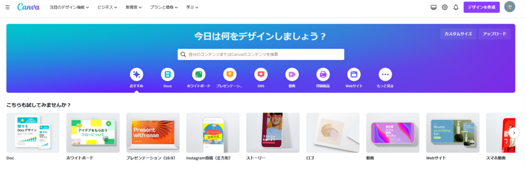 After logging in, the home screen offers options for what type of design you want to create. Your choice here determines the canvas size. Changing canvas size later is slightly inconvenient, so it’s worth thinking about your target size in advance.