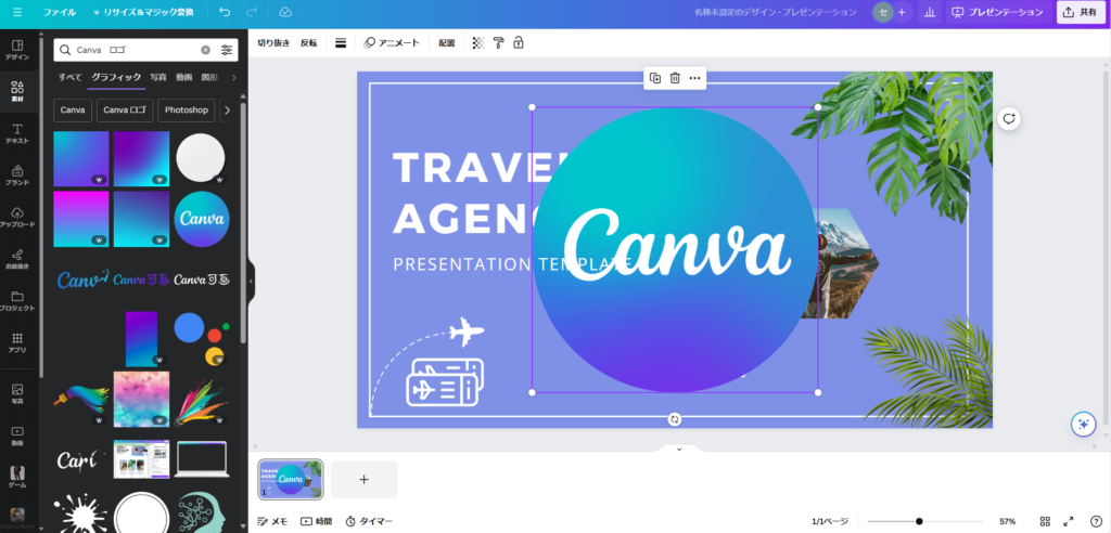 For example, searching “Canva logo” returns many Canva logo options. Clicking an asset places it on your canvas.